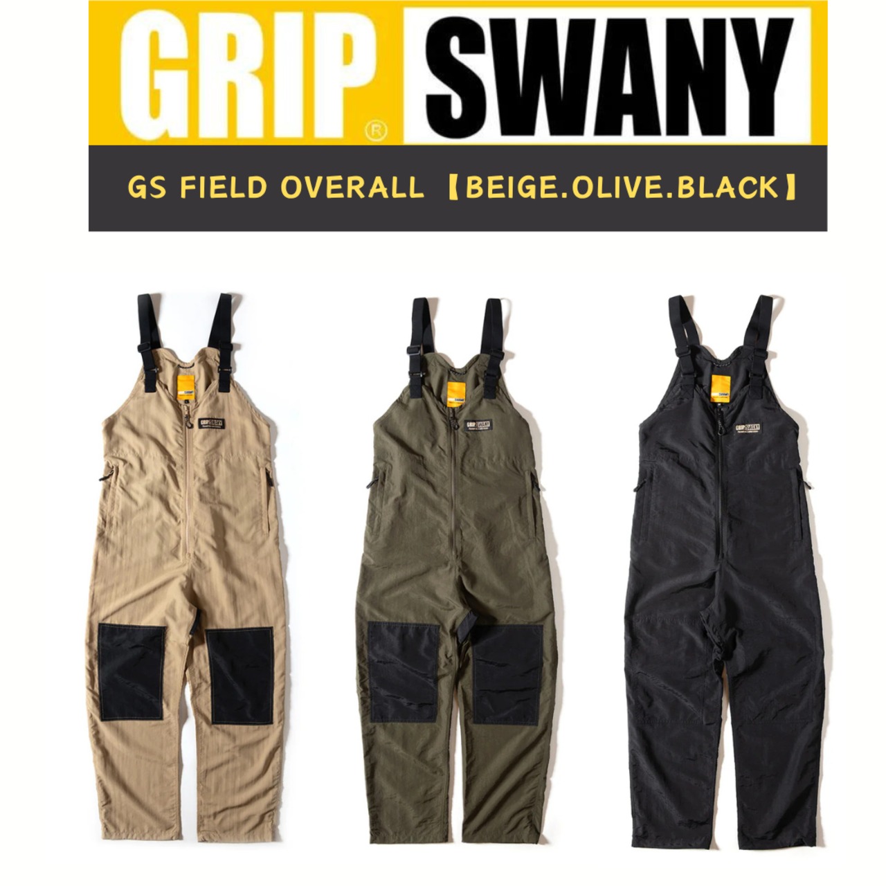 ヴィンテージ感のあるナイロン素材を使用したオーバーオール。撥水性があり、少量の雨なら対応可能です。脱ぎ着しやすいセンタージップ仕様。配色の補強布がアクセントになっています。