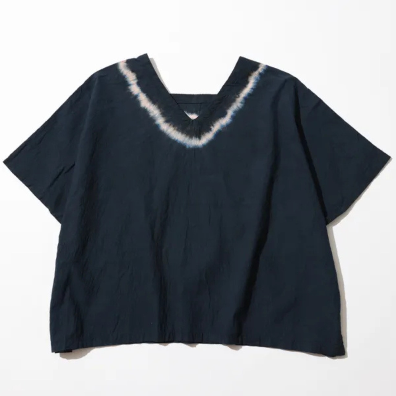 襟周りに絞り模様を施し、全体を藍泥染でシックな印象に。
